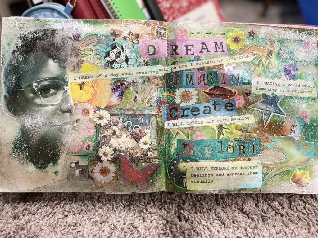 I’ve been researching ways to try different techniques with my junk journals and colleges. A trip to the library lead me to a book called, “Art Journal Workshop” by Traci Bunkers. This is a good book because she offers great technical tips for working in your art journal. The last chapter has prompt exercises. I was so into the book that I figured why not try a prompt or two.